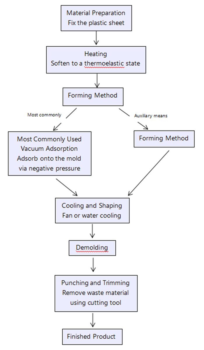 ძირითადი პრინციპი: გაათბეთ და დაარბილეთ პლასტმასის ფურცელი, შემდეგ გამოიყენეთ ვაკუუმი, რომ შეიწოვება იგი ფორმის ზედაპირზე და ის ფორმას მიიღებს გაგრილების შემდეგ.